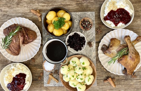 Menuen består af confiterede andelår - saftige og super møre - samt lækkert andebryst med rødkål, hvide og brunede kartofler samt en kraftig andesauce.