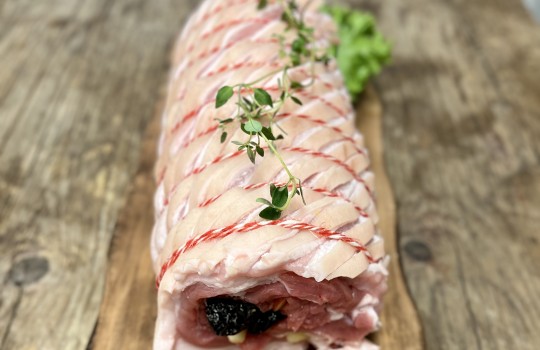 En lækker juleporchetta som er fyldt, ridset og snørret - lige klar til tilberedning.